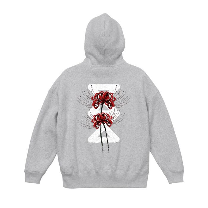 背面に咲き誇る彼岸花のアートワークと、ブランドロゴを大胆に配置した一枚。